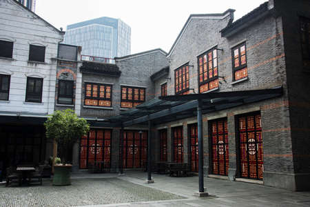 Shanghai, China - September 2019: Buildings and shophouses built in traditional Chinese architecture style located along the Qibao Old Street in Qibao Ancient Town, a historic water township of Qibao in the Minhang District of Shanghai, China
