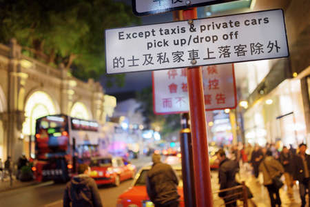 Traffic signs on the street of night city Hong Kong. Hong Kong is a popular tourist attraction of Asia and leading financial centre of the world.