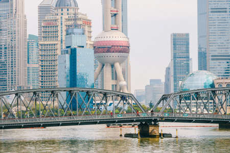 SHANGHAI CHINA, APRIL 2019 : morning sunrise at the bund, huangpu riverside, shanghai city view background