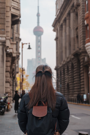 woman traveler visiting in Shanghai, China. Happy Female Tourist sightseeing Oriental Pearl Tower view in The Rock Bund of Shanghai. landmark and popular for tourism attractions. Travel and Vacation