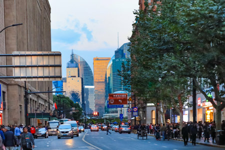 Shanghai, China - September 2019: People on walk street paralleled both sides by commercial buildings located on the eastern part of Nanjing Road, the busiest shopping street in downtown business centre of Shanghai city, China