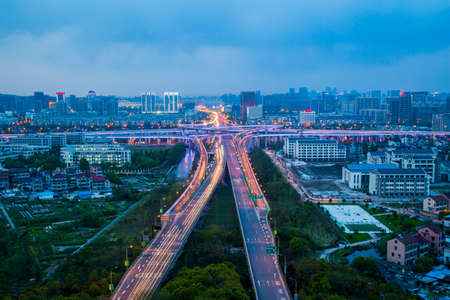 Aerial view of viaduct and city landscape, Nanchang, China.