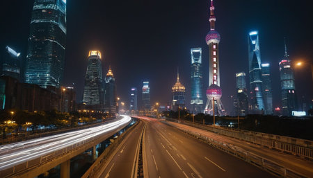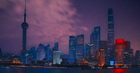 Night starry sky above Shanghai Skyscrapers. reflection of Shanghais skyscrapers amidst bustling urban life at evening.