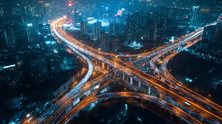 Aerial view of a brightly lit expressway interchange at night, glowing city lights reflecting on car roofs, symbolizing advanced urban infrastructure and financial technology