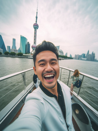 Generative AI : Handsome man taking a selfie on a trip in Asia