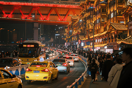 Urban landscape features busy streets filled with vehicles and vibrant city lights showing the evening activity and tall buildings surrounding the area