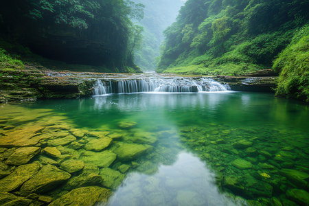 Explore the serene beauty of a bamboo forest featuring a stunning waterfall, surrounded by vibrant greenery and reflective waters