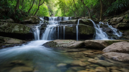 Tranquil scene of flowing water in a lush green forest generated by artificial intelligence