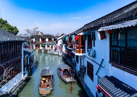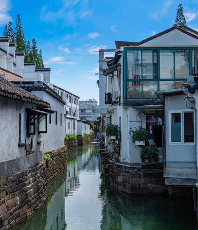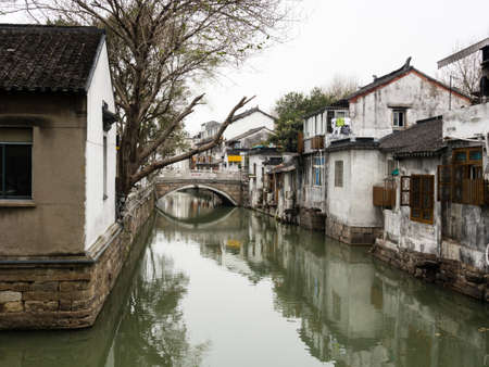 Suzhou, China - October 23,2016: Suzhou old town canal and folk houses in Suzhou, Jiangsu, China. Suzhou is one of the old watertowns in China.