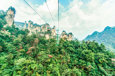Cable crossing giant pillar mountains in Tianzi Mountain and Yellow Stone Stronghold (Huangshi Zhai), Zhangjiajie National Park, China