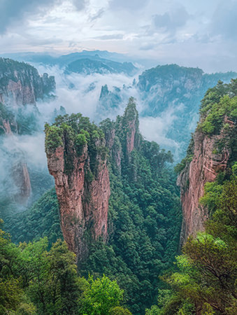 Cloudy day at the Three Natural Bridges, China, with low-hanging mist shrouding the peaks of the limestone arches. No people included.