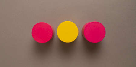 Top view of three round colorful cylinders on gray background. Flat lay.