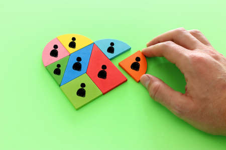 image of heart shape tangram puzzle blocks with people icons over wooden table ,human resources and management concept