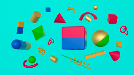 3d render, abstract background with assorted primitive shapes and geometric elements stuck together into compact block, isolated clip art