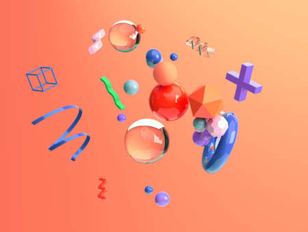 Realistic primitives in abstract composition. Spheres, cylinders, cubes, cone in different colors. 3D rendering. Blank for design. Layout. Abstraction. Minimalism