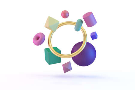 Group of colorful geometric shapes with golden ring on white background