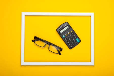 Eyeglasses and calculator in white frame on yellow background. Top view