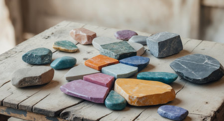 AI Generated. Colorful Natural Stones Arranged on a Workshop Table Background