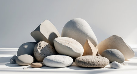 This image showcases a thoughtful arrangement of stacked stones, featuring various shapes and textures on a clean white surface, ideal for design inspiration.
