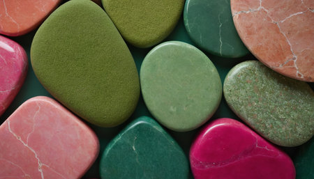 A striking arrangement of colorful smooth pebbles lies against a dark background. Each stone showcases unique textures and hues, creating a serene composition.