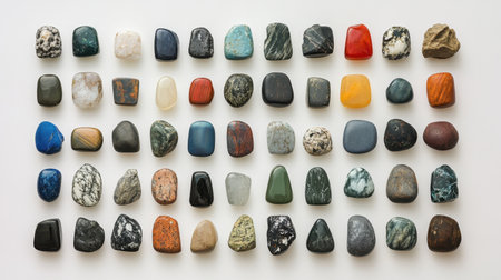 This image showcases a stunning array of polished stones arranged meticulously, highlighting their diverse colors and textures, ideal for art projects or educational purposes.