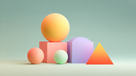 A minimalist arrangement of soft pastel spheres, cylinders, and blocks on a smooth gradient background, showcasing...