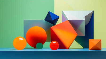 This vibrant image features a striking arrangement of geometric shapes in various colors on a bold split background, perfect for artistic themes and modern design projects.
