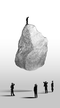 Graphic composition of businessman standing on massive stone above observing group. Collage of 3 models