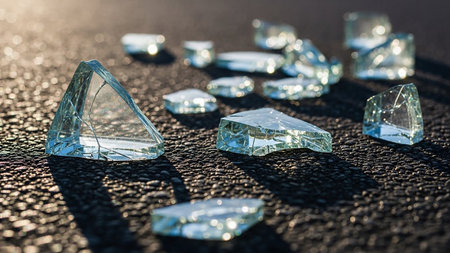 Sharp, transparent shards of broken glass are scattered across a dark, textured asphalt surface.