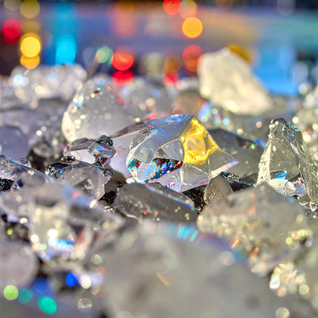 A dazzling close-up of shimmering crystal fragments catching the light, creating a beautiful and abstract texture.