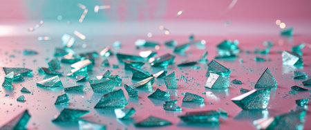 A vibrant collection of shattered mirror pieces scattered across a surface, reflecting light and creating stunning visual effects. The interplay of fragments and glimmers offers a captivating artistic composition ideal for various design projects.