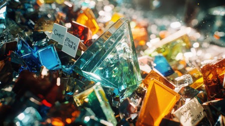 Close-up of recycled glass shards in different colors, glistening under sunlight in a recycling facility