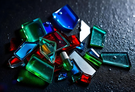 Colorful glass shards of various shapes and sizes are scattering on a wet black surface, creating a vibrant and abstract composition with light reflections