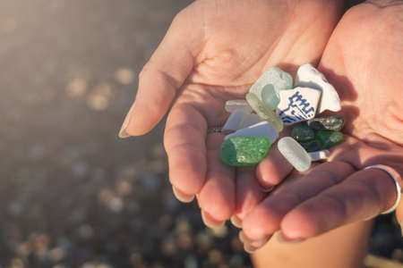Sea glass and sea pottery pieces in the hands of a young woman close-up
