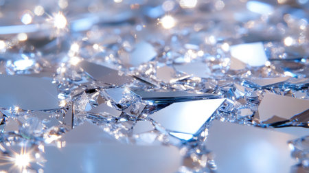 A close-up view of a shattered glass surface featuring sparkling reflections and highlights, creating an artistic and elegant appearance ideal for modern designs.