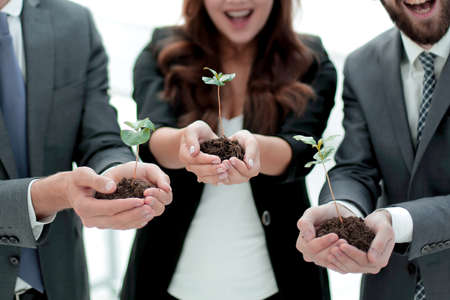 Teamwork nurtures business growth. a group of businesspeople holding plants growing out of soil.