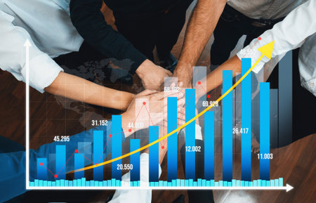 A dynamic visual representation showcasing teamwork and business growth, featuring diverse hands united over a rising chart, symbolizing collaboration and collective success. Amity