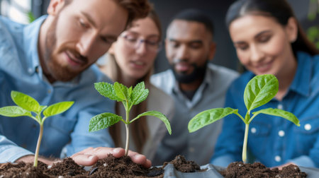 Success doesnt just happen, youve got to nurture it. a group of people holding plants growing out of soil.