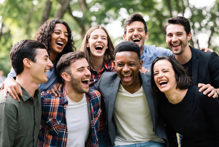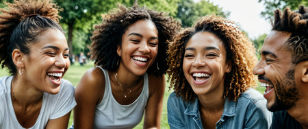 Group of diverse friends laughing and having fun together in the park.