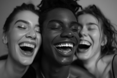 A vibrant black and white image capturing a group of diverse individuals erupting in joyful laughter, showcasing genuine happiness and camaraderie.