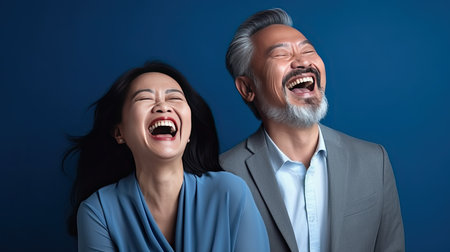 A joyful couple laughing together against vibrant purple background