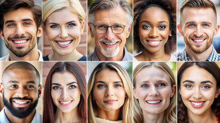 A vibrant collage of diverse smiling faces featuring men and women of various ages and ethnicities, all showcasing genuine happiness and natural joy. Ideal for representing positivity, diversity, human connection, and emotional well-being.