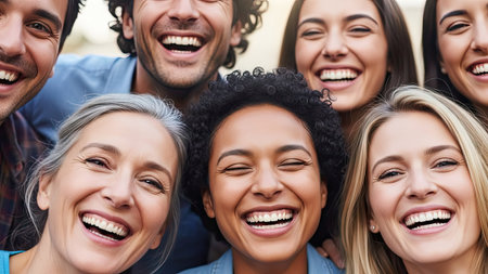 A close-up photograph showcases a diverse group of people joyfully laughing. The composition features individuals with varying skin tones and hair colors, creating a vibrant visual. The image is brightly lit, highlighting the subjects' expressions and teeth. This image could be used for various commercial and editorial purposes.