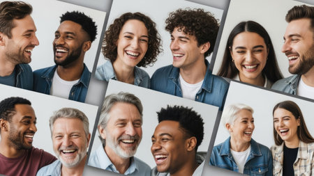 A collage presents multiple individuals of diverse backgrounds. They are smiling and laughing. The portraits use soft lighting. The composition features a variety of skin tones and ages. This image may be suitable for use in advertising, editorial content, or promotional materials that celebrate inclusivity.