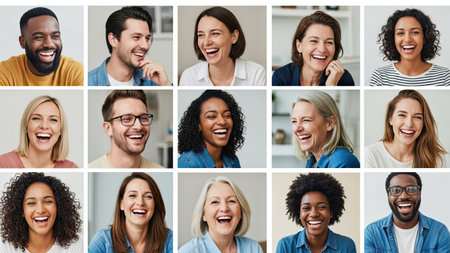 This image presents a collage of people from various backgrounds, all shown laughing. The close-up shots emphasize facial expressions, showcasing bright smiles and expressions of joy. The lighting is soft and even, highlighting skin tones. This composition could be used for advertising, editorial content, or projects related to happiness.