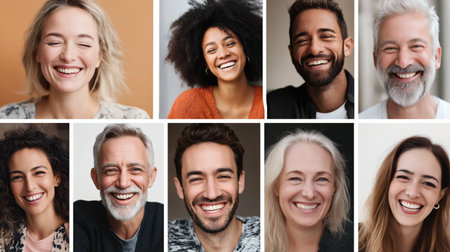 A composite image showcases a grid of diverse individuals, all smiling broadly. The portraits reveal a range of ages, ethnicities, and genders. The lighting appears soft and even, highlighting the expressions. The images could be used for various commercial purposes, such as illustrating positivity or representing a community.