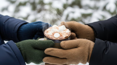 A group of friends huddle together in the snow, each holding a mug of steaming hot chocolate topped with marshmallows. They are wearing colorful winter gloves, enjoying the warmth and camaraderie on a chilly day.