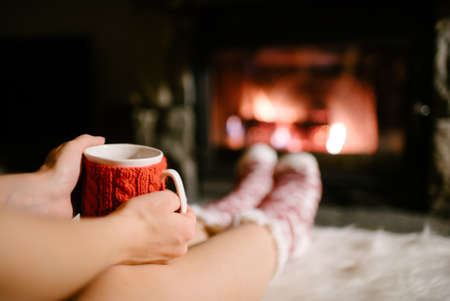 Woman holding a cup of tea by the Christmas fireplace. Woman relaxes by warm fire with a cup of hot drink and warming up her feet in woollen socks. Close up on feet. Winter, Christmas holidays concept