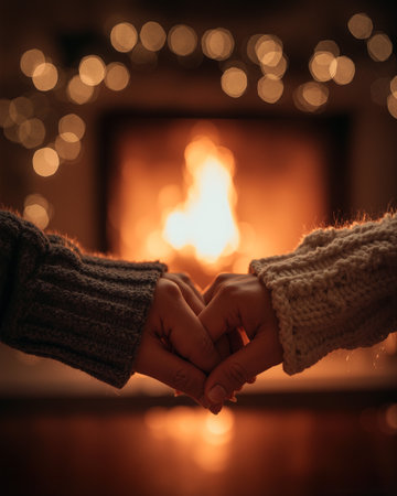 Couple enjoys a cozy moment holding hands in front of a warm fireplace with soft glowing lights
