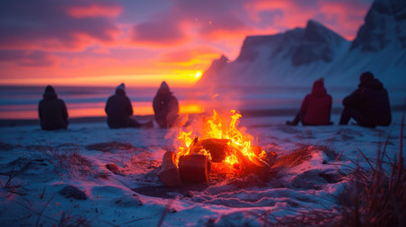 Friends around campfire in snowy forest. Bare trees, thick snow. Serene winter night scene. Laughter and conversation fill the air as they enjoy each others company.